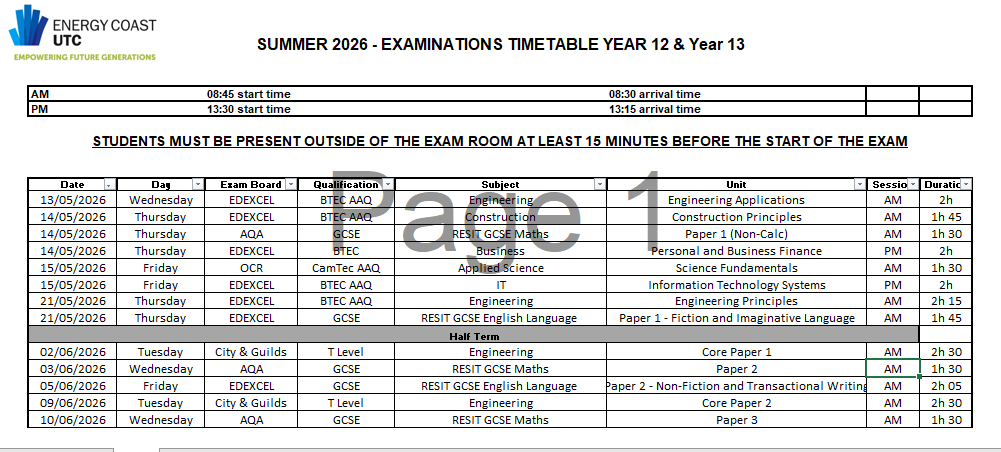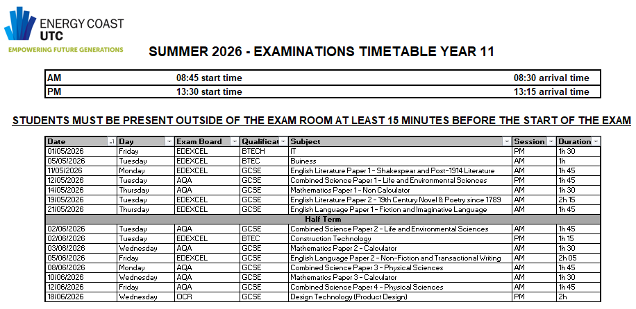 The Exams Officer can be contacted by email exams@energycoastutc.co.uk